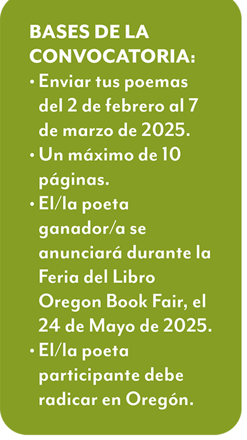 Le extendemos una cordial invitación para que se una a nosotros como voz creativa en la Feria del Libro de Oregon, una celebración del arte, la cultura y la literatura.